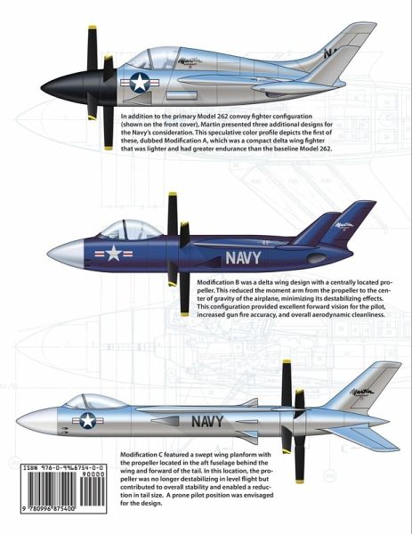 The Martin Model 262 was an unconventional turboprop VTOL aircraft proposal submitted to the US Navy's convoy fighter competition of 1950, which ultimately produced the Convair XFY-1 Pogo and Lockheed XFV-1 Salmon. It was a swept-wing aircraft with triple vertical tails powered by an Allison XT-40-A-8 turboprop engine driving 16 ft contra-rotating propellers. The launch and recovery system consisted of a hinged vertical platform mounted on a merchant ship; the pilot approached the platform from the side and hovered vertically just in front of it, attaching the aircraft to the platform with a retractable nosegear spike and landing on two small wing gear. The fighter was armed with four 20 mm cannon and was designed to protect convoy vessels from enemy air attack. In addition to the basic Model 262, Martin also presented Modifications A, B and C, the configurations of which were even more unorthodox than the main proposal. Finally, the book examines the Model 262P, a handsome scale demonstrator designed to verify the basic soundness of the concept. This 52 page publication features 56 illustrations, including detailed schematics, artist's impressions, and speculative color profiles of these remarkable secret aircraft projects. It is printed in color throughout on heavy paper stock and has a full color glossy cover. This is the publisher's second book covering the convoy fighter competition, the first one being devoted to the Goodyear GA-28A/B, which is still available from bookstores worldwide.