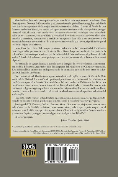 Martín Rivas, one of the most important novels by Alberto Blest Gana constitutes a clear example of the best chilean narrative tradition. Over the background of a frustrated liberal rebellion, amidst the growing opportunism of the political ruling class, the author sketches a love and social climb story, told with remarkable tact, equilibrium and vivacity. Province and capital, people and elite, french imitators and mixed race, romantics and social climbers, all make for and enliven a social picture of recognizable XIX Century hues. Martín Rivas is an entertaining whilst significative novel, that the reader cannot but enjoy. This is the fourth Martin Rivas edition by Dr Jaime Concha, the chilean critic who teaches at the University of California, and builds upon his other editions (Editorial Ayacucho, and the Oxford University Press, English version), by adding notes that will certainly help the clear understanding of the text as originally intended by the author.