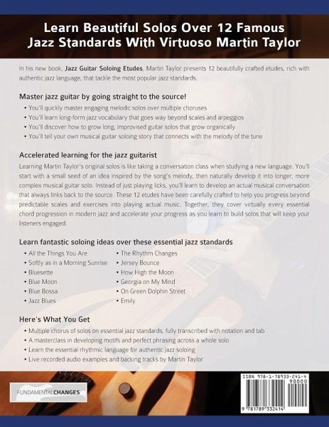 Learn Martin Taylor's Jazz Guitar Solos on Classic Standards Are you struggling to play complete guitar solos on jazz standards? Do you want to progress from playing "just licks" to developing long, meaningful solos that tell a story? Are you stuck trying to solo over longer combinations of common jazz guitar chord changes? In his new book, Jazz Guitar Soloing Etudes, Martin Taylor presents 12 beautifully crafted jazz guitar etudes, rich with authentic jazz language, that tackle the most popular jazz standards. Master jazz guitar by going straight to the source! · You'll quickly master engaging melodic solos over multiple choruses · You'll learn long-form jazz vocabulary that goes way beyond scales and arpeggios · You'll discover how to grow long, improvised guitar solos that grow organically · You'll tell your own musical guitar soloing story that connects with the melody of the tune Accelerated learning for the jazz guitarist Learning Martin Taylor's original solos is like taking a conversation class when studying a new language. You'll start with a small seed of an idea inspired by the song's melody, then naturally develop it into longer, more complex musical guitar solo. Instead of just playing licks, you'll learn to develop an actual musical conversation that always links back to the source. These 12 etudes have been carefully crafted to help you progress beyond predictable scales and exercises into playing actual music. Together, they cover virtually every essential chord progression in modern jazz and accelerate your progress as you learn to build solos that will keep your listeners engaged. Martin Taylor's actual jazz guitar solos over these essential standards · All the Things You Are · Softly as in a Morning Sunrise · Bluesette · Blue Moon · Blue Bossa · Jazz Blues · The Rhythm Changes · Jersey Bounce · How High the Moon · Georgia on My Mind · On Green Dolphin Street · Emily These etudes will help you to internalise the language of jazz guitar soloing. It's time to throw away the complex theory books and lick encyclopaedias and master the actual craft of soloing. You'll can even download Martin's own live recordings of his solos along with twelve original backing tracks! Martin Taylor's Jazz Guitar Soloing Etudes - Here's What You Get: · Multiple chorus of solos on essential jazz standards, fully transcribed with notation and tab · A masterclass in developing motifs and perfect phrasing across a whole solo · Learn the essential rhythmic language for authentic jazz soloing · Live recorded audio examples and backing tracks by Martin Taylor This book distils 50 years of virtuosic playing experience into direct jazz guitar vocabulary and feel to help you take a massive step forward in your m