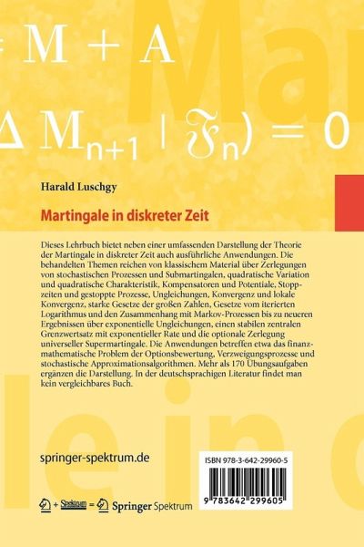 Dieses Lehrbuch bietet neben einer umfassenden Darstellung der Theorie der Martingale in diskreter Zeit auch ausführliche Anwendungen. Die behandelten Themen reichen von klassischem Material über Zerlegungen von stochastischen Prozessen und Submartingalen, quadratische Variation und quadratische Charakteristik, Kompensatoren und Potentiale, Stoppzeiten und gestoppte Prozesse, Ungleichungen, Konvergenz und lokale Konvergenz, starke Gesetze der großen Zahlen, Gesetze vom iterierten Logarithmus und den Zusammenhang mit Markov-Prozessen bis zu neueren Ergebnissen über exponentielle Ungleichungen, einen stabilen zentralen Grenzwertsatz mit exponentieller Rate und die optionale Zerlegung universeller Supermartingale. Die Anwendungen betreffen etwa das finanzmathematische Problem der Optionsbewertung, Verzweigungsprozesse und stochastische Approximationsalgorithmen. Mehr als 170 Übungsaufgaben ergänzen die Darstellung. In der deutschsprachigen Literatur findet man kein vergleichbares Buch..