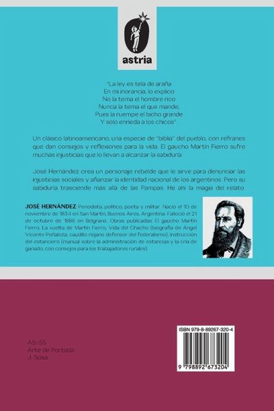 "La ley es tela de araña En mi inorancia, lo explico No la tema el hombre rico Nunca la tema el que mande; Pues la ruempe el bicho grande Y solo enrieda a los chicos". Un clásico latinoamericano, una especie de "biblia" del pueblo, con refranes que dan consejos y reflexiones para la vida. El gaucho Martín Fierro sufre muchas injusticias que lo llevan a alcanzar la sabiduría. José Hernández crea un personaje rebelde que le sirve para denunciar las injusticias sociales y afianzar la identidad nacional de los argentinos. Pero su sabiduría trasciende más allá de las Pampas. He ahí la magia del relato. JOSÉ HERNÁNDEZ. Periodista, político, poeta y militar. Nació el 10 de noviembre de 1834 en San Martín, Buenos Aires, Argentina. Falleció el 21 de octubre de 1886 en Belgrano. Obras publicadas: El gaucho Martín Fierro, La vuelta de Martín Fierro, Vida del Chacho (biografía de Ángel Vicente Peñaloza, caudillo riojano defensor del federalismo), Instrucción del estanciero (manual sobre la administración de estancias y la cría de ganado, con consejos para los trabajadores rurales).