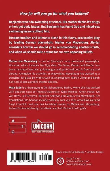 A new play by one of Germany's most prominent playwrights, available for the first time in English. Benjamin won't do swimming at school. His mum thinks he's on drugs or has body issues. But Benjamin has found God and mixed-sex swimming lessons offend him. Martyr considers when we should accommodate others' beliefs, and when we should take a stand.