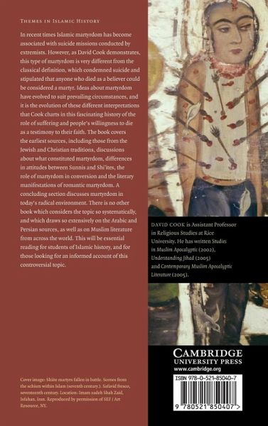 In recent times Islamic martyrdom has become associated with suicide missions conducted by extremists. However, as David Cook demonstrates, this type of martyrdom is very different from the classical definition which condemned suicide and stipulated that anyone who died a believer could be considered a martyr. Ideas about martyrdom have evolved to suit prevailing circumstances, and it is the evolution of these interpretations that Cook charts in this fascinating history. The book covers the earliest sources on martyrdom including those from the Jewish and Christian traditions, discussions about what constituted martyrdom, and differences in attitudes between Sunnis and Shi'ites. A concluding section discusses martyrdom in today's radical environment. There is no other book which considers the topic so systematically, and which draws so widely on the literary sources. This will be essential reading for students of Islamic history, and for those looking for an informed account of this controversial topic.