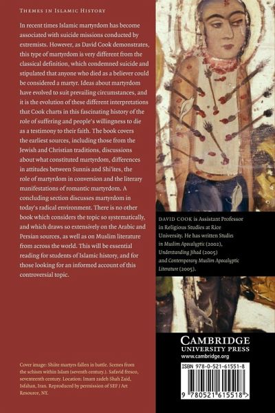 In recent times Islamic martyrdom has become associated with suicide missions conducted by extremists. However, as David Cook demonstrates, this type of martyrdom is very different from the classical definition which condemned suicide and stipulated that anyone who died a believer could be considered a martyr. Ideas about martyrdom have evolved to suit prevailing circumstances, and it is the evolution of these interpretations that Cook charts in this fascinating history. The book covers the earliest sources on martyrdom including those from the Jewish and Christian traditions, discussions about what constituted martyrdom, and differences in attitudes between Sunnis and Shi'ites. A concluding section discusses martyrdom in today's radical environment. There is no other book which considers the topic so systematically, and which draws so widely on the literary sources. This will be essential reading for students of Islamic history, and for those looking for an informed account of this controversial topic.