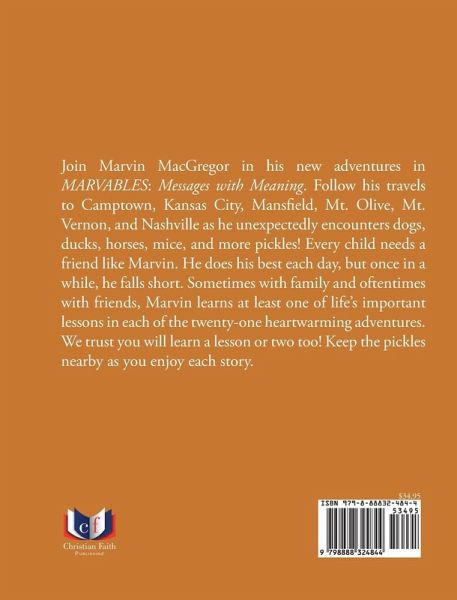 Join Marvin MacGregor in his new adventures in MARVABLES: Messages with Meaning. Follow his travels to Camptown, Kansas City, Mansfield, Mt. Olive, Mt. Vernon, and Nashville as he unexpectedly encounters dogs, ducks, horses, mice, and more pickles! Every child needs a friend like Marvin. He does his best each day, but once in a while, he falls short. Sometimes with family and oftentimes with friends, Marvin learns at least one of life's important lessons in each of the twenty-one heartwarming adventures. We trust you will learn a lesson or two too! Keep the pickles nearby as you enjoy each story.