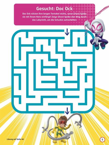 Begleite Spidey, Spin und Ghost-Spider durch verworrene Labyrinthe und löse knifflige Rätsel. Fehlersuchbilder, Schattenrätsel, Sudokus und vieles mehr erwarten dich! Mit den vielen Ausmalbildern kannst du die Welt der Marvel-Superheld_innen in deinen Lieblingsfarben erstrahlen lassen.