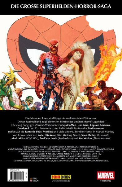 DIE GROSSE SUPERHELDEN-HORROR-SAGADie lebenden Toten sind längst ein multimediales Phänomen.Dieser Sammelband zeigt die ersten Schritte der untoten Marvel-Legenden: Die ewig hungrigen Zombie-Versionen von Spider-Man, Iron Man, Captain America, Deadpool und Co. fressen sich durch die Wirklichkeiten des Multiversums, treffen auf die Fantastic Four, Morbius und viele andere. Zombie-Horror in Marvel-Manier, von Comic-Stars wie Robert Kirkman (The Walking Dead), Sean Phillips (Criminal), Mark Millar (Civil War), Fred Van Lente (Spider-Man) und Kev Walker (Thunderbolts).ENTHÄLT: MARVEL ZOMBIES: DEAD DAYS (2007) 1, MARVEL APES: PRIME EIGHT (2009) 1, MARVEL ZOMBIES: EVIL EVOLUTION (2010) 1, ULTIMATE FANTASTIC FOUR (2004) 21-23 & 30-32, MARVEL ZOMBIES (2006) 1-5, BLACK PANTHER (2005) 28-30, MARVEL ZOMBIES 2 (2007) 1-5, MARVEL ZOMBIES RETURN (2009) 1-5, MARVEL ZOMBIES 3 (2008) 1-4, MARVEL ZOMBIES 4 (2009) 1-4, MARVEL ZOMBIES 5 (2010) 1-5, MARVEL ZOMBIES SUPREME (2011) 1-5, MATERIAL AUS MARVEL APES: SPEEDBALL (2009) 1, MARVEL APES: AMAZING SPIDER-MONKEY (2009) 1, MARVEL APES: GRUNT LINE (2009) 1, ULTIMATE FANTASTIC FOUR (2004) 24, 27 & 29, BLACK PANTHER (2005) 27 UND JEDE MENGE BONUSMATERIAL