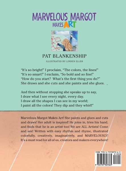 "It's so bright!" I proclaim, "The colors, the lines!" "It's so smart!" I exclaim, "So bold and so fine!" "How do you start? What's the first thing you do?" She draws and she cuts and she paints and she glues. And then without stopping she speaks up to say, I draw what I see every night, every day. I draw all the shapes I can see in my world; I paint all the colors! They dip and they whirl!" Marvelous Margot Makes Art! She paints and glues and cuts and draws! Her adult is inspired! He joins in, tries his hand, and finds that he is an artist too! We are ALL Artists! Come and see! Written with easy rhythm and rhyme, illustrated colorfully, creatively, imaginatively, and MARVELOUSLY! It's a must read for all of us, creators and makers everywhere!
