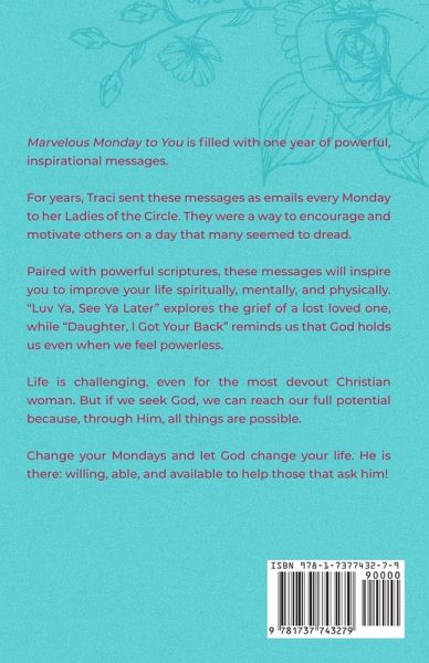 Marvelous Monday to You is filled with one year of powerful, inspirational messages. For years, Traci sent these messages as emails every Monday to her Ladies of the Circle. They were a way to encourage and motivate others on a day that many seemed to dread. Painted with powerful scriptures, these messages will inspire you to improve your life, spiritually, mentally, and physically.