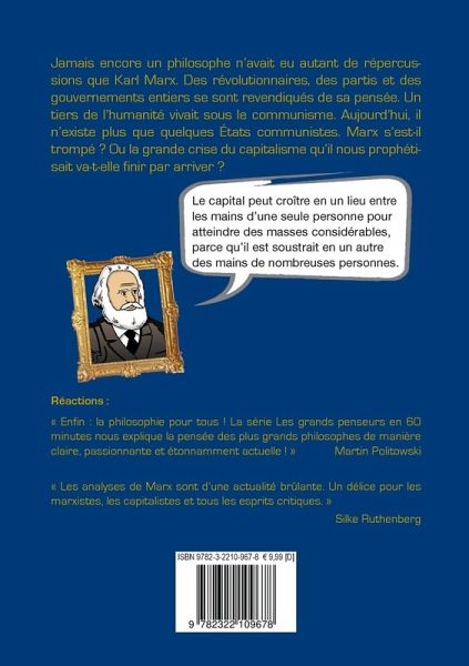 Sur la base de soixante-dix citations, le livre " Marx en 60 minutes " offre un éclairage sur sa philosophie de l'histoire, sa théorie de l'infrastructure-superstructure, sa critique de la religion ainsi que ses analyses sur la plus-value, l'accumulation et la paupérisation. Dans la deuxième partie du livre, ses conclusions sont appliquées à la situation actuelle. Le livre est publié dans la collection à succès " Grands penseurs en 60 minutes ".