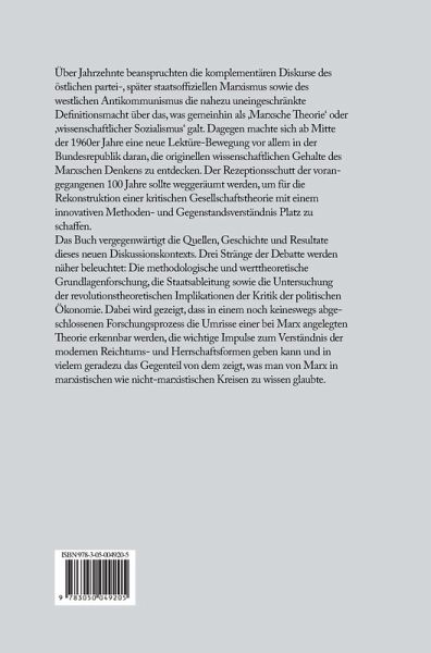 Über Jahrzehnte beanspruchten die komplementären Diskurse des östlichen partei-, später staatsoffiziellen Marxismus sowie des westlichen Antikommunismus die nahezu uneingeschränkte Definitionsmacht über das, was gemeinhin als 'Marxsche Theorie' oder 'wissenschaftlicher Sozialismus' galt. Dagegen machte sich ab Mitte der 1960er Jahre eine neue Lektüre-Bewegung vor allem in der Bundesrepublik daran, die originellen wissenschaftlichen Gehalte des Marxschen Denkens zu entdecken. Der Rezeptionsschutt der vorangegangenen 100 Jahre sollte weggeräumt werden, um für die Rekonstruktion einer kritischen Gesellschaftstheorie mit einem innovativen Methoden- und Gegenstandsverständnis Platz zu schaffen. Das Buch vergegenwärtigt die Quellen, Geschichte und Resultate dieses neuen Diskussionskontexts. Drei Stränge der Debatte werden näher beleuchtet: die methodologische und werttheoretische Grundlagenforschung, die Staatsableitung sowie die Untersuchung der revolutionstheoretischen Implikationen der Kritik der politischen Ökonomie. Dabei wird gezeigt, dass in einem noch keineswegs abgeschlossenen Forschungsprozess die Umrisse einer bei Marx angelegten Theorie erkennbar werden, die wichtige Impulse zum Verständnis der modernen Reichtums- und Herrschaftsformen geben kann und in vielem geradezu das Gegenteil von dem zeigt, was man von Marx in marxistischen wie nicht-marxistischen Kreisen zu wissen glaubte.