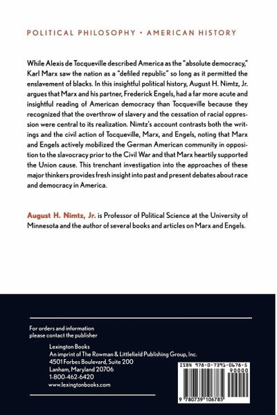 While Alexis de Tocqueville described America as the 'absolute democracy,' Karl Marx saw the nation as a 'defiled republic' so long as it permitted the enslavement of blacks. In this insightful political history, Nimtz argues that Marx and his partner, Frederick Engels, had a far more acute and insightful reading of American democracy than Tocqueville because they recognized that the overthrow of slavery and the cessation of racial oppression were central to its realization. Nimtz's account contrasts both the writings and the civil action of Tocqueville, Marx and Engels, noting that Marx and Engels actively mobilized the German-American community in opposition to the slavocracy prior to the Civil War, and that Marx heavily supported the Union cause. This potent and insightful investigation into the approaches of two major thinkers provides fresh insight into past and present debates about race and democracy in America.