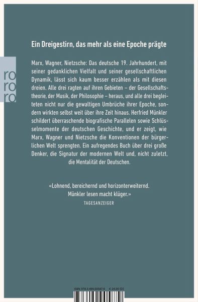 Marx, Wagner, Nietzsche - diese drei Denker haben das 19. wie das 20. Jahrhundert tief beeinflusst. Als Zeitgenossen, die sich wechselseitig mit Verehrung, Ablehnung oder Ignoranz gegenüberstanden, prägten sie eine Zeit von enormer wissenschaftlicher Vielfalt und gesellschaftlicher Dynamik. Ihre Antagonismen und Widersprüche führen ins Herz der deutschen Entwicklung. Herfried Münkler folgt diesen drei faszinierenden Gestalten und ruft damit eine ganze Epoche wach. Er schildert die verblüffenden Parallelen im Leben von Marx und Wagner: die Beteiligung an der 1848er-Revolution, Flucht, Vertreibung und Exil, vielerlei Wirren und dann doch das Schaffen eines überragenden Werkes, die Bildung einer großen Anhängerschaft und die schwierige Verantwortung für das, was diese Anhängerschaft aus den Entwürfen gemacht hat. Nietzsche, der etwas Jüngere, ist dann ein philosophisches Ereignis, wie Marx prägt er Generationen. Alle drei sprengen die Konventionen der bürgerlichen Welt, erschaffen Neues - das aber dann zu einer anderen, unerwarteten Wirklichkeit wird: Das so vielversprechende, reiche deutsche 19. Jahrhundert geht über ins Zeitalter der Extreme, der politischen Katastrophen. - Ein aufregendes Buch über drei große Denker, die Signatur der modernen Welt und, nicht zuletzt, die Mentalität der Deutschen.