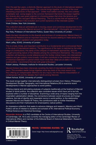 This book brings together internationally-distinguished scholars from History, Philosophy, Development Studies, Geography, and International Relations (IR) to examine recent developments in Marxist approaches to world politics. Offering original and stimulating analyses of subjects traditionally at the forefront of Marxist studies of world politics, the collection also considers issues which have yet to be fully explored within a number of disciplines. Examining a wide array of topics ranging from the imperialism-globalization debate, the connections between social structures and foreign relations, the role of identity and imperialist norms in world politics, to the relationship between Marxist and Realist IR Theory, the contributors seek to further theoretical discussions and their implications for emancipatory radical politics. These contributions are structured around two major themes: ¿ The relationship between capitalist modernity and the states-system in explaining the changing patterns of inter-state conflict and cooperation; ¿ The debates within Marxist and IR discourses on the theoretical significance of 'the international', covering topics including uneven and combined development and passive revolution. An impressive collection that seeks to advance dialogue and research, Marxism and World Politics will be of interest to students and scholars of IR, International Political Economy, Political Science, and Historical Sociology.