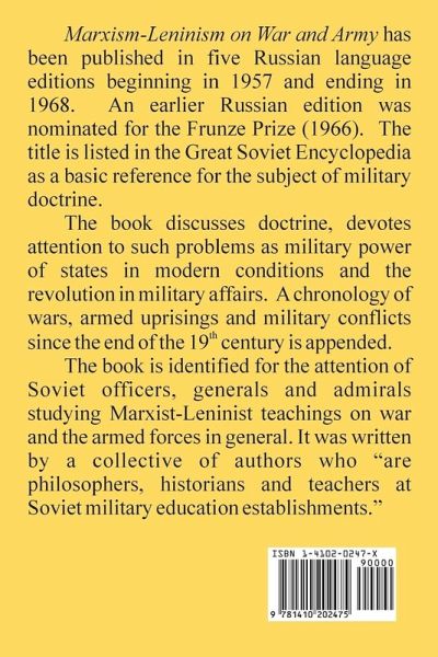 Marxism-Leninism on War and Army has been published in five Russian language editions beginning in 1957 and ending in 1968. An earlier Russian edition was nominated for the Frunze Prize (1966). The title is listed in the Great Soviet Encyclopedia as a basic reference for the subject of military doctrine. The book discusses doctrine, devotes attention to such problems as military power of states in modern conditions and the revolution in military affairs. A chronology of wars, armed uprisings and military conflicts since the end of the 19th century is appended. The book is identified for the attention of Soviet officers, generals and admirals studying Marxist-Leninist teachings on war and the armed forces in general. It was written by a collective of authors who "are philosophers, historians and teachers at Soviet military education establishments."