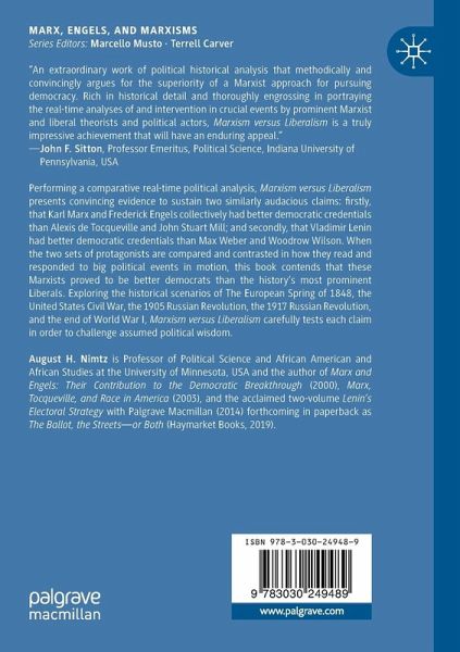 Performing a comparative real-time political analysis, Marxism versus Liberalism presents convincing evidence to sustain two similarly audacious claims: firstly, that Karl Marx and Frederick Engels collectively had better democratic credentials than Alexis de Tocqueville and John Stuart Mill; and secondly, that Vladimir Lenin had better democratic credentials than Max Weber and Woodrow Wilson. When the two sets of protagonists are compared and contrasted in how they read and responded to big political events in motion, this book contends that these Marxists proved to be better democrats than the history's most prominent Liberals. Exploring the historical scenarios of The European Spring of 1848, the United States Civil War, the 1905 Russian Revolution, the 1917 Russian Revolution, and the end of World War I, Marxism versus Liberalism carefully tests each claim in order to challenge assumed political wisdom.