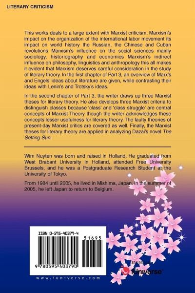 This works deals to a large extent with Marxist criticism. Marxism's impact on the organization of the international labor movement its impact on world history the Russian, the Chinese and Cuban revolutions Marxism's influence on the social sciences mainly sociology, historiography and economics Marxism's indirect influence on philosophy, linguistics and anthropology this all makes it evident that Marxism deserves careful consideration in the study of literary theory. In the first chapter of Part 3, an overview of Marx's and Engels' ideas about literature are given, while contrasting their ideas with Lenin's and Trotsky's ideas. In the second chapter of Part 3, the writer draws up three Marxist theses for literary theory. He also develops three Marxist criteria to distinguish classes because 'class' and 'class struggle' are central concepts of Marxist Theory though the writer acknowledges these concepts lesser usefulness for literary theory. The faulty theories of present-day Marxist critics are covered as well. Finally, the Marxist theses for literary theory are applied in analyzing Dazai's novel The Setting Sun.