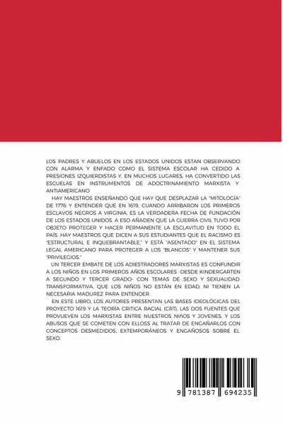 Los padres y abuelos en los Estados Unidos están observando con alarma y enfado como el sistema escolar ha cedido a presiones izquierdistas y, en muchos lugares, ha convertido las escuelas en instrumentos de adoctrinamiento Marxista y Antiamericano. Hay maestros enseñando que hay que desplazar la "mitología" de 1776 y entender que 1619, cuando arribaron los primeros esclavos negros a Virginia, es la verdadera fecha de fundación de los Estados Unidos. A eso añaden que la Guerra Civil tuvo por objeto proteger y hacer permanente la esclavitud en todo el país; hay maestros que le dicen a sus estudiantes que el racismo es "estructural e inquebrantable," y está "asentado" en el sistema legal, para proteger a los "blancos," y mantener sus "privilegios." Un tercer embate de los adiestradores Marxistas es confundir a los niños en sus primeros años escolares, desde Kindergarten a Segundo y Tercer grado, con temas de sexo y sexualidad transformativa, que los niños no están en edad, ni tienen la necesaria madurez para entender. En este libro, los autores presentan las bases ideológicas del Proyecto 1619 y la Teoría Crítica Racial (CRT), las dos fuentes que promueven el credo Marxista entre nuestros jóvenes, y los abusos que se cometen con los niños al tratar de engañarlos con conceptos desmedidos, extemporáneos y engañosos sobre el sexo.