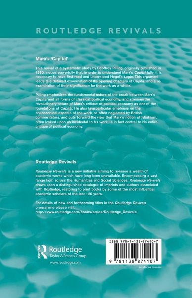 Marx's Capital has of course been widely read; this revival of a systematic study by Geoffrey Pilling, originally published in 1980, argues powerfully that, in order to understand Capital fully, it is necessary to have read and understood Hegel's Logic. This argument leads to a detailed examination of the opening chapters of Capital, and a re-examination of their significance for the work as a whole. Pilling emphasizes the fundamental nature of the break between Marx's Capital and all forms of classical political economy, and stresses the revolutionary nature of Marx's critique of political economy as one of the foundations of Capital. He also lays particular emphasis on the philosophical aspects of the work, so often neglected by British commentators, and puts forward the view that Marx's notion of fetishism, often looked upon as incidental to his work, is in fact central to his entire critique of political economy.