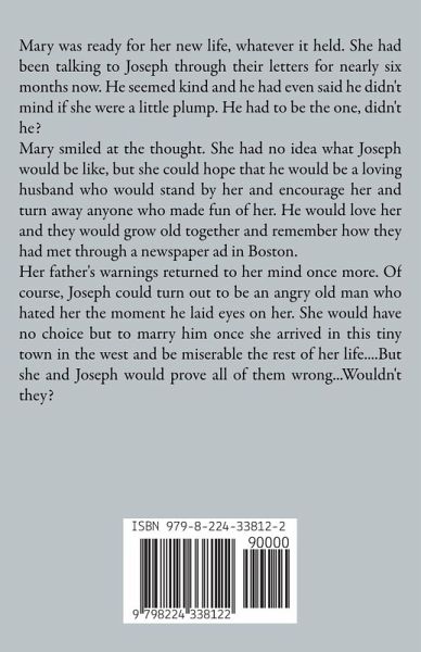 Mary was ready for her new life, whatever it held. She had been talking to Joseph through their letters for nearly six months now. He seemed kind and he had even said he didn't mind if she were a little plump. He had to be the one, didn't he? Mary smiled at the thought. She had no idea what Joseph would be like, but she could hope that he would be a loving husband who would stand by her and encourage her and turn away anyone who made fun of her. He would love her and they would grow old together and remember how they had met through a newspaper ad in Boston. Her father's warnings returned to her mind once more. Of course, Joseph could turn out to be an angry old man who hated her the moment he laid eyes on her. She would have no choice but to marry him once she arrived in this tiny town in the west and be miserable the rest of her life....But she and Joseph would prove all of them wrong...Wouldn't they?