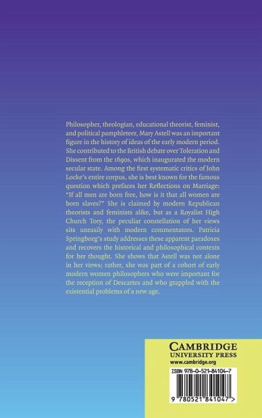Philosopher, theologian, educational theorist, feminist and political pamphleteer, Mary Astell was an important figure in the history of ideas of the early modern period. Among the first systematic critics of John Locke's entire corpus, she is best known for the famous question which prefaces her Reflections on Marriage: 'If all men are born free, how is it that all women are born slaves?' She is claimed by modern Republican theorists and feminists alike but, as a Royalist High Church Tory, the peculiar constellation of her views sits uneasily with modern commentators. Patricia Springborg's study addresses these apparent paradoxes, recovering the historical and philosophical contexts to her thought. She shows that Astell was not alone in her views; rather, she was part of a cohort of early modern women philosophers who were important for the reception of Descartes and who grappled with the existential problems of a new age.