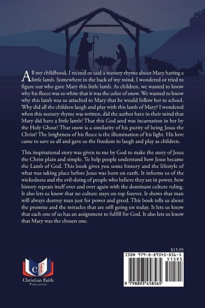 All my childhood, I recited or said a nursery rhyme about Mary having a little lamb. Somewhere in the back of my mind, I wondered or tried to figure out who gave Mary this little lamb. As children, we wanted to know why his fleece was so white that it was the color of snow. We wanted to know why this lamb was so attached to Mary that he would follow her to school. Why did all the children laugh and play with this lamb of Mary? I wondered when this nursery rhyme was written, did the author have in their mind that Mary did have a little lamb? That this God seed was incarnation in her by the Holy Ghost? That snow is a similarity of his purity of being Jesus the Christ? The brightness of his fleece is the illumination of his light. His love came to save us all and gave us the freedom to laugh and play as children. This inspirational story was given to me by God to make the story of Jesus the Christ plain and simple. To help people understand how Jesus became the Lamb of God. This book gives you some history and the lifestyle of what was taking place before Jesus was born on earth. It informs us of the wickedness and the evil-doing of people who believe they are in power, how history repeats itself over and over again with the dominant culture ruling. It also lets us know that no culture stays on top forever. It shows that man will always destroy man just for power and greed. This book tells us about the promise and the miracles that are still going on today. It lets us know that each one of us has an assignment to fulfill for God. It also lets us know that Mary was the chosen one.
