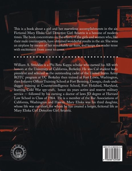 Our heroine in these two volumes which total 18 chapters, Mary Eliska Girl Detective Girl Aviatrix, is a well-off young lady whose grandfather Albert Stricklin is a newspaper publisher in Piedmont, California, who supports her as a reporter for his paper The Piedmont Star, aware that she likes to dabble in detective work. Flying in her airplane and driving her jalopy "Calamity Jane", Mary Eliska joins with her three best friends: nieces Jacqueline Gray ("Jax") and Marlow Ray, and nephew news photographer Liam McAdam to solve the occasional case out of curiosity and sometimes to earn money separately from her family. Mary Eliska Girl Detective Girl Aviatrix gives life to my daughter born sixty years ago, March 10, 1963, whose life was cut short in Clifton Springs New York September 12, 1963. She has charming manners, oscillates between tomboyishness and a feminine ideal. She knows law and manifests moral righteousness. Often she wears enviable dresses. Mary Eliska's detective stories and unsolved mysteries I have re-written from the public domain tales by Carolyn Keene (always a pseudonym), Anna Katharine Green, Mildred Augustine Wirt Benson, Frances Crane, and anonymous writers about Penny Parker, Mary Louise, Nancy Drew, and others. Please enjoy reading all 18 chapters of "Mary Eliska Girl Aviatrix. This is a book of about a girl and her marvelous accomplishments in the air. Fictional Mary Eliska Girl Detective Girl Aviatrix is a heroine of modern times. The book concentrates on the efforts of the girls and women who, like their male counterparts, have obtained wonderful results in the air. She wins an airplane by means of her remarkable air feats, and keeps the reader tense with excitement from cover to cover.