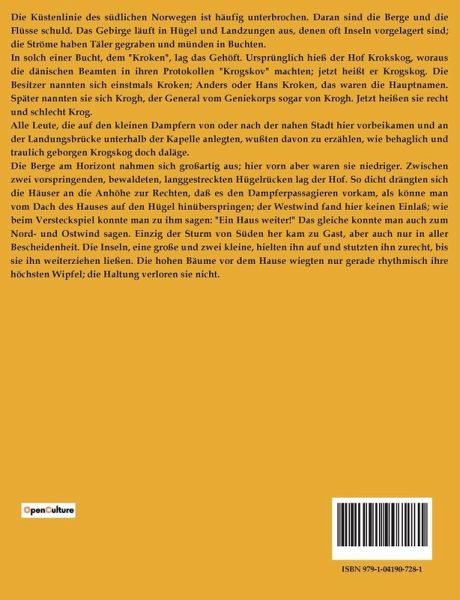 Die Küstenlinie des südlichen Norwegen ist häufig unterbrochen. Daran sind die Berge und die Flüsse schuld. Das Gebirge läuft in Hügel und Landzungen aus, denen oft Inseln vorgelagert sind; die Ströme haben Täler gegraben und münden in Buchten. In solch einer Bucht, dem "Kroken", lag das Gehöft. Ursprünglich hieß der Hof Krokskog, woraus die dänischen Beamten in ihren Protokollen "Krogskov" machten; jetzt heißt er Krogskog. Die Besitzer nannten sich einstmals Kroken; Anders oder Hans Kroken, das waren die Hauptnamen. Später nannten sie sich Krogh, der General vom Geniekorps sogar von Krogh. Jetzt heißen sie recht und schlecht Krog. Alle Leute, die auf den kleinen Dampfern von oder nach der nahen Stadt hier vorbeikamen und an der Landungsbrücke unterhalb der Kapelle anlegten, wußten davon zu erzählen, wie behaglich und traulich geborgen Krogskog doch daläge. Die Berge am Horizont nahmen sich großartig aus; hier vorn aber waren sie niedriger. Zwischen zwei vorspringenden, bewaldeten, langgestreckten Hügelrücken lag der Hof. So dicht drängten sich die Häuser an die Anhöhe zur Rechten, daß es den Dampferpassagieren vorkam, als könne man vom Dach des Hauses auf den Hügel hinüberspringen; der Westwind fand hier keinen Einlaß; wie beim Versteckspiel konnte man zu ihm sagen: "Ein Haus weiter!" Das gleiche konnte man auch zum Nord- und Ostwind sagen. Einzig der Sturm von Süden her kam zu Gast, aber auch nur in aller Bescheidenheit. Die Inseln, eine große und zwei kleine, hielten ihn auf und stutzten ihn zurecht, bis sie ihn weiterziehen ließen. Die hohen Bäume vor dem Hause wiegten nur gerade rhythmisch ihre höchsten Wipfel; die Haltung verloren sie nicht.