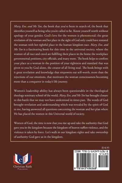 Mary, Eve, and Me Too, the book that you’ve been in search of, the book that identifies yourself as being who you’re called to be. Know yourself worth without apology of your gender. God’s love for the women is phenomenal; the great revelation of the woman and her place in the sight of God only could have restored the woman with her rightful place in the human kingdom race. Mary, Eve, and Me Too is a fascinating book for this time in the universal society, where the women of all race and creed are fulfilling their places in the home the workplace governmental positions, city officials, and many more. The book helps to confirm your place as a woman in the position of your rightness and standard that was given to you by God alone, the creator of all living soul. The book brings with it great revelation and knowledge that empowers our self-worth, more than the rejections of our emotions, that motivates the woman consciousness becoming more than a conqueror in today’s life journey. Women’s leadership ability has always been questionable in the theological theology seminary school of the world. Mary, Eve, and Me Too has brought closure to this battle that we may not have understood in times past. The words of God brought revelation and understanding which was revealed by the spirit of God to me, having answered all questions concerning the woman and her plan where He has placed the women in this Universal world of society. Women of God, the time is now that you rise up and take the authority that God gave you in the kingdom because the kingdom of heaven suffers violence, and the violence is taken by force. Let’s walk in our kingdom rights and take ownership of authority God gave us in the kingdom.