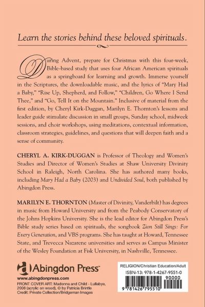 Mary Had a Baby: An Advent Bible Study Based on African American Spirituals , written by Marilyn E. Thornton with material from the first edition by Cheryl Kirk-Duggan. Mary Had a Babyhas four sessions, one for each week of Advent, and is perfect for small groups, Sunday school, midweek sessions, and choir workshops. Each lesson includes Scripture, song lyrics, devotional and contextual information, and discussion questions to stimulate deepening faith and a sense of community. The book includes leader helps. The four spirituals featured in Mary Had a Baby are "Mary Had a Baby," "Rise Up Shepherd and Follow," "Children, Go Where I Send Thee, " and "Go, Tell It on the Mountain." A mp3 file of the four songs is available free with purchase of the study.