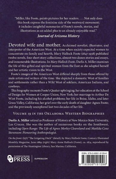 Devoted wife and mother. Acclaimed novelist, illustrator, and interpreter of the American West. At a time when society expected women to concentrate on family and hearth, Mary Hallock Foote (1847-1938) published twelve novels, four short story collections, almost two dozen stories and essays, and innumerable illustrations. In Mary Hallock Foote, Darlis A. Miller examines the life of this gifted and spirited woman from the East as she adapted herself and her artistic vision to the West. Foote's images of the American West differed sharply from those offered by male artists and writers of the time. She depicted a more gentle West, a domestic West of families and settlements rather than a Wild West of soldiers, American Indians, and cowboys. Miller examines how Foote's career was molded by the East-West tensions she experienced throughout her adult life and by society's expectations of womanhood and motherhood. This biography recounts Foote's Quaker upbringing; her education at the School of Design for Women at Cooper Union, New York; her marriage to Arthur De Wint Foote, including his alcohol problems; her life in Boise, Idaho, and later Grass Valley, California; her grief over the early death of daughter Agnes Foote; and the previously unexplored last two decades of her life. Miller has made extensive use of every major archive of letters and documents by and about Foote. She sheds light on Foote's numerous stories, essays, and novels. And examines all pertinent sources on Foote's life and works. Anyone interested in the American West, women's history, or life histories in general will find Miller's biography of Mary Hallock Foote fascinating.