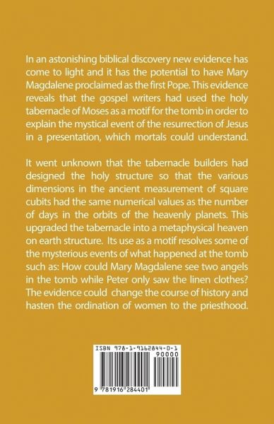 This is the untold story of Mary Magdalene because new evidence has been uncovered, which shows that Jesus had chosen her as his successor. The breakthrough came when an answer was found for the following puzzle in the Gospel of John: How could Mary Magdalene see two angels sitting in the tomb on the morning of the resurrection while Peter could only see the folded linen clothes? The new evidence shows that the gospel writers had applied the holy tabernacle of Moses in place of the tomb to explain the resurrection of Jesus. That was why it stated in the gospels that the veil of the temple or tabernacle was torn in two when Jesus died on the cross. Those writers wrote the gospels some thirty to seventy years after the resurrection and they had a purpose for using the holy tabernacle in place of the tomb. The tabernacle was a mobile temple and it had two rooms one of which was where the regular priests were restricted too. In contrast, the other inner room was reserved for God and only the high priest could enter into it and it had two cherubim sitting at either end of the Lord's seat. With the tabernacle as an image for the tomb it indicated that Peter only had access to the outer room where he saw the linen clothes whereas Mary Magdalene was able to see into the inner room where she saw the two angelic cherubim sitting at either end of where the body of Jesus had lain on the seat. It meant that Mary Magdalene had the same status as the traditional high priest and was therefore destined to succeed Jesus. She should now be recognised as the first Pope.