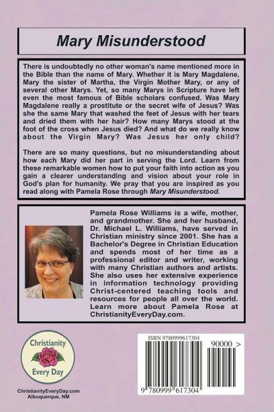 There is undoubtedly no other woman's name mentioned more in the Bible than the name of Mary. Whether it is Mary Magdalene, Mary the sister of Martha, the Virgin Mother Mary, or any of several other Marys. Yet, so many Marys in Scripture have left even the most famous of Bible scholars confused. Was Mary Magdalene really a prostitute or the secret wife of Jesus? Was she the same Mary that washed the feet of Jesus with her tears and dried them with her hair? How many Marys stood at the foot of the cross when Jesus died? And what do we really know about the Virgin Mary? Was Jesus her only child? There are so many questions, but no misunderstanding about how each Mary did her part in serving the Lord. Learn from these remarkable women how to put your faith into action as you gain a clearer understanding and vision about your role in God's plan for humanity. We pray that you are inspired as you read along with Pamela Rose through Mary Misunderstood.