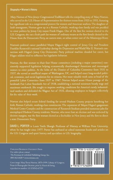 The book tells the compelling story of Mary Norton of New Jersey, who served 13 terms in the United States House of Representatives (1925-1951) and was the first female elected to the United States Congress from the Democratic Party, an eastern state, or urban section east of the Mississippi River and to chair a major congressional committee. Besides chairing the District of Columbia Committee, she steered through the Labor Committee and the House the landmark Fair Labor Standards Act of 1938 and inspired young women of limited educational and meager financial background to participate in politics.