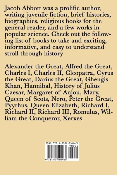 Jacob Abbott was a prolific author, writing juvenile fiction, brief histories, biographies, religious books for the general reader, and a few works in popular science. Check out the following list of books to take and exciting, informative, and easy to understand stroll through history Alexander the Great, Alfred the Great, Charles I, Charles II, Cleopatra, Cyrus the Great, Darius the Great, Ghengis Khan, Hannibal, History of Julius Caesar, Margaret of Anjou, Mary, Queen of Scots, Nero, Peter the Great, Pyyrhus, Queen Elizabeth, Richard I, Richard II, Richard III, Romulus, William the Conqueror, Xerxes