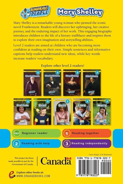 Mary Shelley is a remarkable young woman who penned the iconic novel Frankenstein. Readers will discover her upbringing, her creative journey, and the enduring impact of her work. This engaging biography introduces children to the life of a literary trailblazer and inspires them to explore their own imagination and storytelling abilities. ¿¿¿Level 2 readers are aimed at children who are becoming more confident at reading on their own. Simple sentences and informative captions help readers understand new ideas, while key words increase readers' vocabulary. This project has been made possible in part by the Government of Canada.