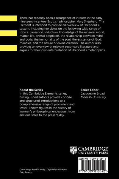 This Element provides an overview of Shepherd's system, including her views on the following wide range of topics: causation, induction, knowledge of the external world, matter, life, animal cognition, the relationship between mind and body, the immortality of the soul, the existence of God, miracles, and the nature of divine creation.