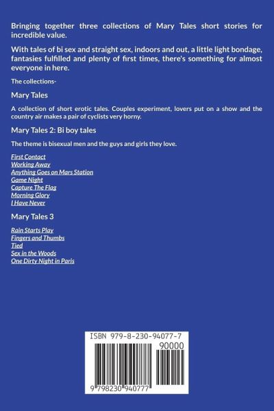 Bringing together three collections of Mary Tales short stories for incredible value. With tales of bi sex and straight sex, indoors and out, a little light bondage, fantasies fulfilled and plenty of first times, there's something for almost everyone in here. The collections- Mary Tales A collection of short erotic tales. Couples experiment, lovers put on a show and the country air makes a pair of cyclists very horny. Mary Tales 2: Bi boy tales The theme is bisexual men and the guys and girls they love. First Contact We dive straight into the narrator's first experience with a couple. Nervous and excited, he doesn't know what to do with himself at first, but that soon changes. Working Away A short term flat share becomes something much more when the hosts invite their guest into the bedroom. Anything Goes on Mars Station After all the time it takes to get astronauts out to the space station in orbit over Mars it's vitally important that they get on. The team bonding exercise is very dirty and takes place in the zero gravity "Heart" of the station. Game Night Robert meets his neighbours, Miranda and Julian, and gets to know them much more intimately as they play a racing game with stripping and sex as forfeits for losing. Capture The Flag Eve is introduced to the special rules Rebecca and Dave have for their wargames. She can resurrect her dead soldiers and put them back on the board, but there's a forfeit to be paid every time. Morning Glory Mike is woken by Karen and Roger. His lovers treat him to coffee and much, much more. I Have Never A novelette about the development of a casual bi relationship. An admission during a drinking game sees Mark and Paul going home together and exploring the gay side of their bisexuality. As the relationship develops they try out all the things they have never done before. Then they meet Julie, and things get really interesting. Mary Tales 3 Rain Starts Play It's John and Karen's third date. They're supposed to be having a picnic, but it's raining, so they'll have to think of something else to do instead..... Fingers and Thumbs There are few better ways to wake than with your lover's gentle fingers playing with you. Tied She's helpless on the bed, hands tied above her head and eyes covered with a mask. She can only imagine what he shall do and wait for his teasing to begin. Sex in the Woods Something is stirring amongst the trees, and it's very horny. In "If you go down to the woods" Sally takes Mark to the wood at the bottom of her parents' garden, where she used to run around naked. Whilst a "Bicycle Race" stops being competitive and quickly becomes erotic. One Dirty Night in Paris Mark is in Paris, but there's not much time for sightseeing when he meets Australian backpacker Kary. After bumping heads as they go for the same butt plug she asks for a demonstration of how it's used and things just get wilder from then on.