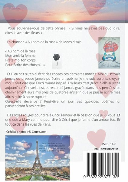 Entre roses roses et roses noires, des roses ardentes pour y bruler d'amour.Voici le troisième opus, fait de proses et de chansons dont je rêve entendre sur les ondes magiques, mes paroles misent en musique.Le titre de ce recueil " Un entredeux entre deux âges " est pour marquer la différence d'âge entre Mary et moi et pour situer l'histoire entre les deux premiers tomes. J'ai terminé l'écriture de ce recueil à l'âge de 54 ans. C'est la suite de " Mary, tome 2 : 51 Dans l'eau " mais il peut se lire entre " Mary tome 1 : 50 Ça se tente " et " Mary tome 2 " : 51 Dans l'eau ".Il parle de l'amour de ma vie, de son surnom Cricri, suivi d'une ode la concernant s'intitulant" Paris, Mary, mon amie, mon amour ". Pourquoi Mary ? En fait, un jour où j'étais à me morfondre dans mon lit à ressasser sans cesse que je ne trouverai jamais la bonne personne à aimer, j'ai prié le bon Dieu afin qu'il me vienne en aide pour trouver la femme de ma vie. Et ça a marché ! Quelques jours plus tard en discothèque, je rencontrais Christelle. C'était un don de Dieu, surtout avec un tel prénom. Alors, comme elle est venue du ciel, un peu comme Mary Poppins descend nous rendre visite avec son parapluie, dans cette ode je l'ai appelée Mary.Ce recueil est écrit avec la réforme de la nouvelle orthographe.