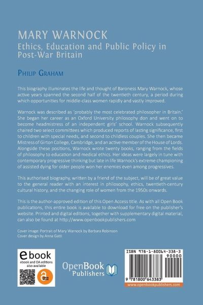 This biography illuminates the life and thought of Baroness Mary Warnock, whose active years spanned the second half of the twentieth century, a period during which opportunities for middle-class women rapidly and vastly improved. Warnock was described as 'probably the most celebrated philosopher in Britain.' She began her career as an Oxford University philosophy don and went on to become headmistress of an independent girls' school. Warnock subsequently chaired two select committees which produced reports of lasting significance, first to children with special needs, and second to childless couples. She then became Mistress of Girton College, Cambridge, and an active member of the House of Lords. Alongside these positions, Warnock wrote twenty books, ranging from the fields of philosophy to education and medical ethics. Her ideas were largely in tune with contemporary progressive thinking but late in life Warnock's extreme championing of assisted dying for older people won her enemies even among progressives. This authorised biography, written by a friend of the subject, will be of great value to the general reader with an interest in philosophy, ethics, twentieth-century cultural history, and the changing role of women from the 1950s onwards.