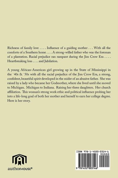 Richness of family love . . . . Influence of a guiding mother . . . . With all the comforts of a Southern home . . . . A strong-willed father who was the foreman of a plantation . . . . . Racial prejudice ran rampant during the Jim Crow Era . . . . Heartbreaking loss . . . . and Jubilation. A young African-American girl growing up in the State of Mississippi in the `40s & `50s with all the racial prejudice of the Jim Crow Era, a strong, confident, beautiful spirit developed in the midst of an abusive father. She was raised by a lady who became her Godmother, where she lived until she moved to Michigan. Michigan to Indiana. Raising her three daughters. Her church affiliation. This woman's strong work ethic and political influence probing her into a life-long goal of both her mother and herself to earn her college degree. Here is her story.