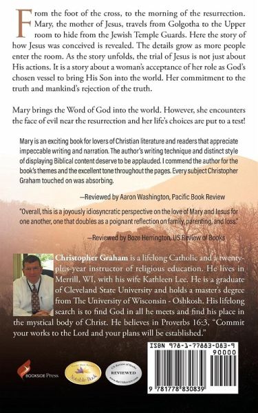 From the foot of the cross, to the morning of the resurrection. Mary, the mother of Jesus, travels from Golgotha to the Upper room to hide from the Jewish Temple Guards. Here the story of how Jesus was conceived is revealed. The details grow as more people enter the room. As the story unfolds, the trial of Jesus is not just about His actions. It is a story about a woman's acceptance of her role as God's chosen vessel to bring His Son into the world. Her commitment to the truth and mankind's rejection of the truth. Mary brings the Word of God into the world. However, she encounters the face of evil near the resurrection and her life's choices are put to a test! Mary is an exciting book for lovers of Christian literature and readers that appreciate impeccable writing and narration. The author's writing technique and distinct style of displaying Biblical content deserve to be applauded. I commend the author for the book's themes and the excellent tone throughout the pages. Every subject Christopher Graham touched on was absorbing. -Reviewed by Aaron Washington, Pacific Book Review "Overall, this is a joyously idiosyncratic perspective on the love of Mary and Jesus for one another, one that doubles as a poignant reflection on family, parenting, and loss." -Reviewed by Boze Herrington, US Review of Books
