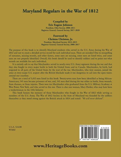 The purpose of this book is to identify Maryland residents who served in the U.S. Army during the War of 1812 and not to create a detailed service record for each individual man. There are mistakes! Due to misspelling of surnames, missing records, and other factors, some men are missing, some men are listed twice, and some men are not properly identified. Overall, this book should be used to identify soldiers and to point out what records are available for each individual. It is entirely safe to say that Marylanders served in nearly every U.S. Army regiment during the war and that they also fought in every major battle in both the United States and in Canada. Marylanders, by birth, had migrated to all parts of the United States by the start of the war. Marylanders, who were seamen, joined the army at every major U.S. seaport after the British blockade made it too dangerous to sail into the open waters around our coastline. There are a total of 5,452 men listed in this book. Twenty-seven men have been identified as being African-Americans; 545 men became prisoners of war; and, 541 men died during the war either in battle, from wounds, from diseases, or from injuries. There were ten Marylanders who graduated from the U.S. Military Academy at West Point, New York, and who served in this war. There is also one woman, Mary Harker, who may have been a washerwoman in the 14th Infantry.This book honors the memory of those Marylanders who fought in the War of 1812 while serving as members of the U.S. Army. The War of 1812 Society in the State of Maryland was founded by the soldiers themselves as they stood strong against the British attack in 1814 and stated: "We will never disband".