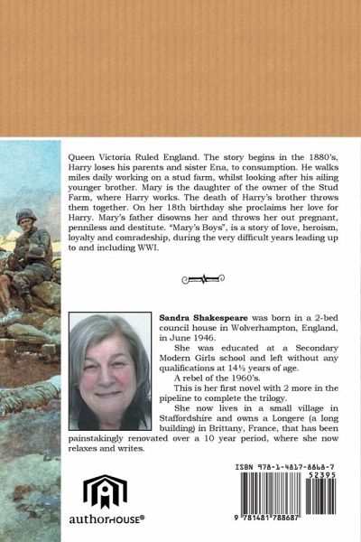 Queen Victoria Ruled England. The story begins in the 1880's, Harry loses his parents and sister Ena, to consumption. He walks miles daily working on a stud farm, whilst looking after his ailing younger brother. Mary is the daughter of the owner of the Stud Farm, where Harry works. The death of Harry's brother throws them together. On her 18th birthday she proclaims her love for Harry. Mary's father disowns her and throws her out pregnant, penniless and destitute. "Mary's Boys", is a story of love, heroism, loyalty and comradeship, during the very difficult years leading up to and including WWI.