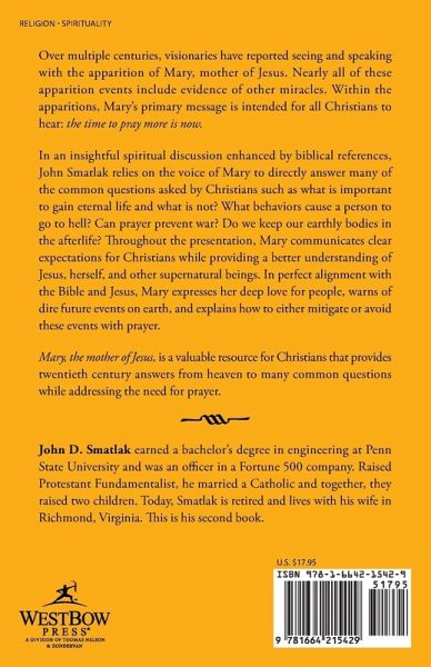 Over multiple centuries, visionaries have reported seeing and speaking with the apparition of Mary, mother of Jesus. Nearly all of these apparition events include evidence of other miracles. Within the apparitions, Mary's primary message is intended for all Christians to hear: the time to pray more is now. In an insightful spiritual discussion enhanced by biblical references, John Smatlak relies on the voice of Mary to directly answer many of the common questions asked by Christians such as what is important to gain eternal life and what is not? What behaviors cause a person to go to hell? Can prayer prevent war? Do we keep our earthly bodies in the afterlife? Throughout the presentation, Mary communicates clear expectations for Christians while providing a better understanding of Jesus, herself, and other supernatural beings. In perfect alignment with the Bible and Jesus, Mary expresses her deep love for people, warns of dire future events on earth, and explains how to either mitigate or avoid these events with prayer. Mary, the mother of Jesus, is a valuable resource for Christians that provides twentieth century answers from heaven to many common questions while addressing the need for prayer.