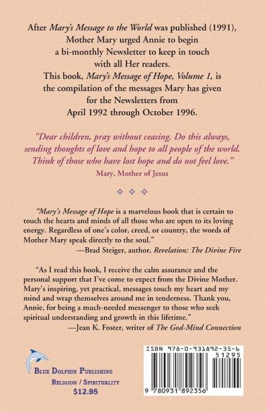 After the best-selling "Mary's Message to the World" was published (1991), Mother Mary urged Annie to begin a bi-monthly Newsletter to keep in touch with all Her readers. This book, "Mary's Message of Hope, Volume 1," is the compilation of the continuing messages Mary has given since April 1992 through October 1996. "'Mary's Message of Hope' is a marvelous book that is certain to touch the hearts and minds of all those who are open to its loving energy. Regardless of one's color, creed, or country, the words of Mother Mary speak directly to the soul." -- Brad Steiger, author, "Revelation: The Divine Fire" "As I read this book, I receive the calm assurance and the personal support that I've come to expect from the Divine Mother. Mary's inspiring, yet practical, messages touch my heart and my mind and wrap themselves around me in tenderness. Thank you, Annie, for being a much-needed messenger to those who seek spiritual understanding and growth in this lifetime." -- Jean K. Foster, author, "The God-Mind Connection" "Dear children, pray without ceasing. Do this always, sending thoughts of love and hope to all people of the world. Think of those who have lost hope and do not feel love." -- Mary, Mother of Jesus