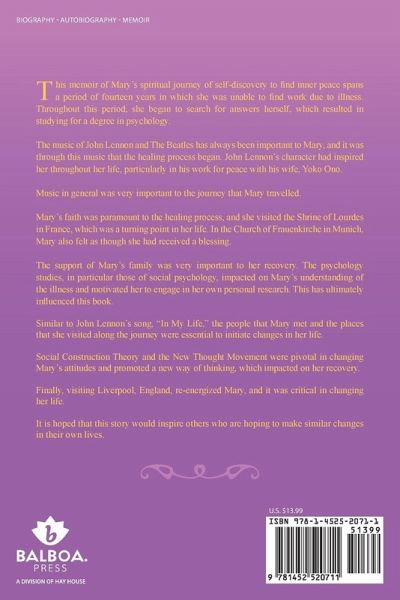 This memoir of Mary's spiritual journey of self-discovery to find inner peace spans a period of fourteen years in which she was unable to find work due to illness. Throughout this period, she began to search for answers herself, which resulted in studying for a degree in psychology. The music of John Lennon and The Beatles has always been important to Mary, and it was through this music that the healing process began. John Lennon's character had inspired her throughout her life, particularly in his work for peace with his wife, Yoko Ono. Music in general was very important to the journey that Mary travelled. Mary's faith was paramount to the healing process, and she visited the Shrine of Lourdes in France, which was a turning point in her life. In the Church of Frauenkirche in Munich, Mary also felt as though she had received a blessing. The support of Mary's family was very important to her recovery. The psychology studies, in particular those of social psychology, impacted on Mary's understanding of the illness and motivated her to engage in her own personal research. This has ultimately influenced this book. Similar to John Lennon's song, "In My Life," the people that Mary met and the places that she visited along the journey were essential to initiate changes in her life. Social Construction Theory and the New Thought Movement were pivotal in changing Mary's attitudes and promoted a new way of thinking, which impacted on her recovery. Finally, visiting Liverpool, England, re-energized Mary, and it was critical in changing her life. It is hoped that this story would inspire others who are hoping to make similar changes in their own lives.