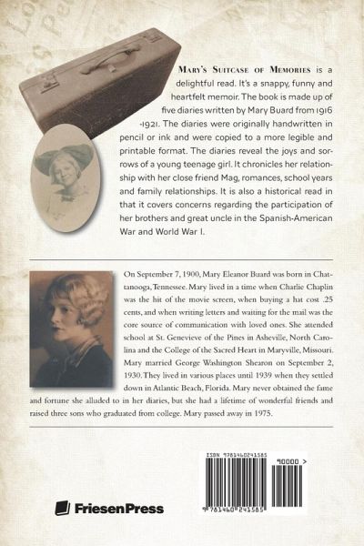 Mary's Suitcase of Memories is a delightful read. It's a snappy, funny and heartfelt memoir. The book is made up of five diaries written by Mary Buard from 1916 -1921. The diaries were originally handwritten in pencil or ink and were copied to a more legible and printable format. The diaries reveal the joys and sorrows of a young teenage girl. It chronicles her relationship with her close friend Mag, romances, school years and family relationships. It is also a historical read in that it covers concerns regarding the participation of her brothers and great uncle in the Spanish-American War and World War I.