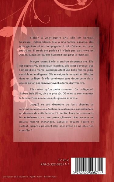Sioban a vingt-quatre ans. Elle est libraire, heureuse, indépendante. Elle a une famille aimante, des amis géniaux et un compagnon. Il est d'ailleurs son seul problème. Il aurait été parfait s'il n'était pas parti vivre en Alsace, supposant qu'elle quitterait tout pour le rejoindre.Maryse quant à elle a environ cinquante ans. Elle est dépressive, alcoolique, instable. Elle n'est devenue que l'ombre d'elle-même. C'était pourtant une belle femme jadis, sensible et intelligente. Elle enseigne le français et l'Histoire dans un collège. Et elle continuera sans doute cette vie si elle ne se fait pas renvoyer avant, à force d'arriver ivre.Elles n'ont qu'un point commun. Ce collège où Sioban était élève, dix ans plus tôt. Où elles se sont connues le temps d'une année sans plus jamais se revoir.Jusqu'à ce soir d'octobre où leurs chemins se rencontrent à nouveau. Sioban ne restera pas insensible face au désarroi de cette femme. Et bientôt, leurs liens naissants les entraîneront sur une pente glissante dont aucune ne pourra repartir inchangée. Laquelle sauvera l'autre et surtout, jusqu'où pourront-elles aller avant de ne plus rien contrôler ?