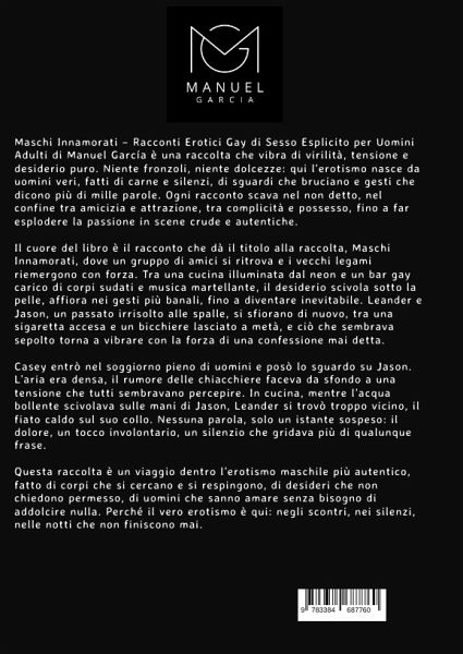 Maschi Innamorati - Racconti Erotici Gay di Sesso Esplicito per Uomini Adulti di Manuel García è una raccolta che vibra di virilità, tensione e desiderio puro. Niente fronzoli, niente dolcezze: qui l'erotismo nasce da uomini veri, fatti di carne e silenzi, di sguardi che bruciano e gesti che dicono più di mille parole. Ogni racconto scava nel non detto, nel confine tra amicizia e attrazione, tra complicità e possesso, fino a far esplodere la passione in scene crude e autentiche.Il cuore del libro è il racconto che dà il titolo alla raccolta, Maschi Innamorati, dove un gruppo di amici si ritrova e i vecchi legami riemergono con forza. Tra una cucina illuminata dal neon e un bar gay carico di corpi sudati e musica martellante, il desiderio scivola sotto la pelle, affiora nei gesti più banali, fino a diventare inevitabile. Leander e Jason, un passato irrisolto alle spalle, si sfiorano di nuovo, tra una sigaretta accesa e un bicchiere lasciato a metà, e ciò che sembrava sepolto tornaa vibrare con la forza di una confessione mai detta.Casey entrò nel soggiorno pieno di uomini e posò lo sguardo su Jason. L'aria era densa, il rumore delle chiacchiere faceva da sfondo a una tensione che tutti sembravano percepire. In cucina, mentre l'acqua bollente scivolava sulle mani di Jason, Leander si trovò troppo vicino, il fiato caldo sul suo collo. Nessuna parola, solo un istante sospeso: il dolore, un tocco involontario, un silenzio che gridava più di qualunque frase.Questa raccolta è un viaggio dentro l'erotismo maschile più autentico, fatto di corpi che si cercano e si respingono, di desideri che non chiedono permesso, di uomini che sanno amare senza bisogno di addolcire nulla. Perché il vero erotismo è qui: negli scontri, nei silenzi, nelle notti che non finiscono mai.